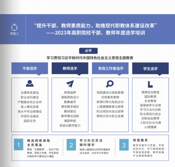 本次网络培训由bv伟德源自英国始于1946主办,国家教育行政学院承办,依托中国教育干部网络学院学习平台组织实施。学校与国家教育行政学院共同研究培训方案,立足于学校工作实际和发展需求,组织了“‘提升干部、教师素质能力,助推现代职教体系建设改革’——2023年职业院校干部、教师年度选学培训”“高职学校党建引领下的业务创新发展专题网络培训”“‘高校辅导员就业指导能力提升’主题工作坊”等14项培训项目,培训内容上突出实用性、系统性和针对性,培训形式上充分发挥网络培训优势,通过“云端”聆听专家讲座、畅谈学习感想、提交研修总结等方式,学思用贯通、知信行统一,使培训真正落到实处,助推学校教育教学工作迈上新台阶。