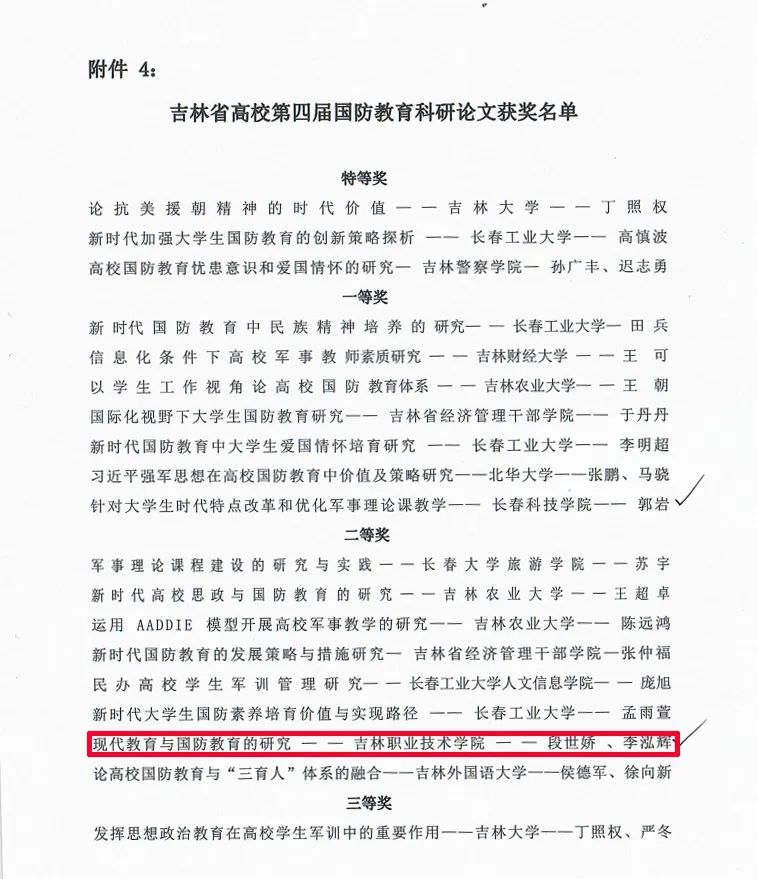 近日,2023年度吉林省普通高等学校国防教育工作先进单位和先进个人评选活动结果公布,bv伟德荣获吉林省高校2023年度国防教育活动优秀组织单位,段世娇、李泓辉获得吉林省高校第四届国防教育科研论文二等奖。尹成龙获得吉林省高校第四届军训摄影特等奖,赵海鹏获得吉林省高校第四届军训摄影特等奖。