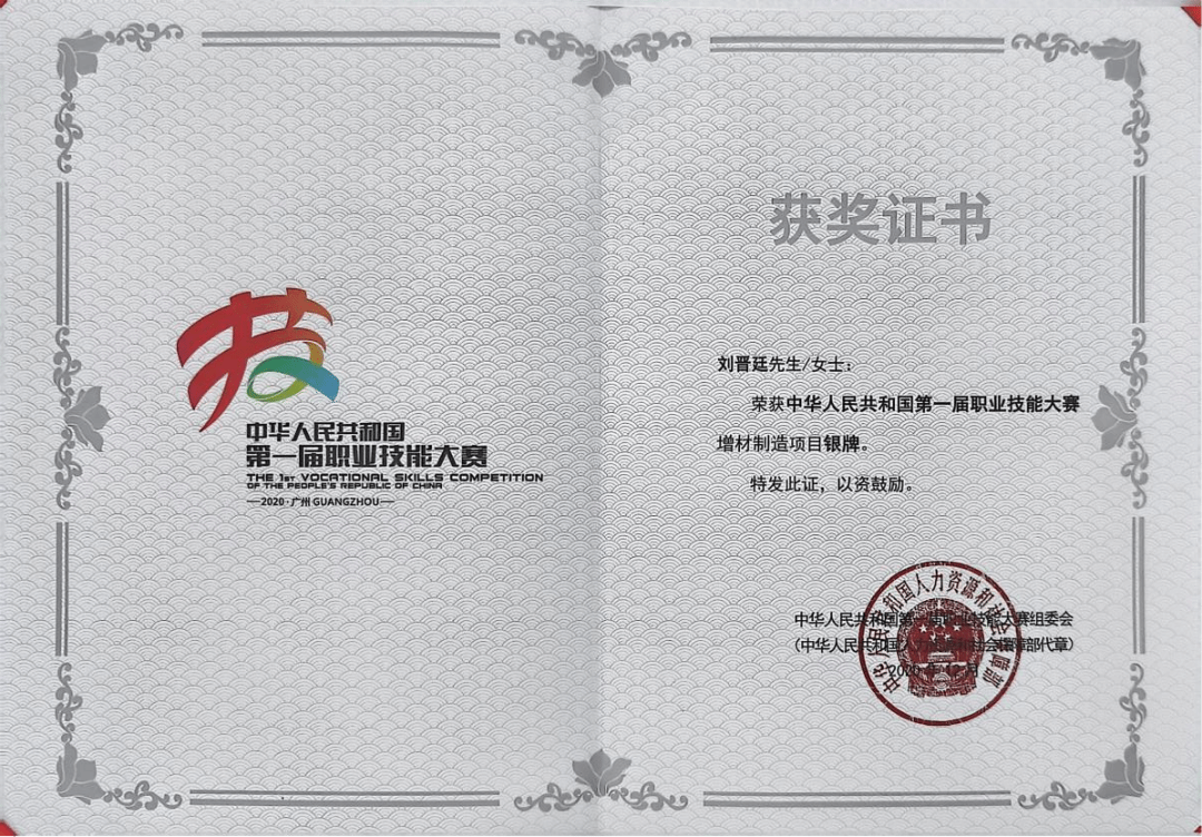 刘晋廷与增材制造技术的缘分,始于校园实训室里的日夜钻研。求学期间,他将课堂知识与实操紧密结合,面对复杂的技术难题,常常在机床前连续奋战十余个小时。这份对专业的执着,让他在技能学习的道路上不断突破。2021 年,在中华人民共和国第一届职业技能大赛中,面对全国顶尖选手,他凭借扎实的技术功底与沉稳的心态,一举斩获增材制造项目银牌。这一成绩不仅为他的职业生涯奠定基础,更让他成为行业内备受瞩目的 “青年黑马”。此后,他活跃于各类赛事,担任增材制造项目吉林省职业技能竞赛专家,以专业视角为行业发展贡献力量。