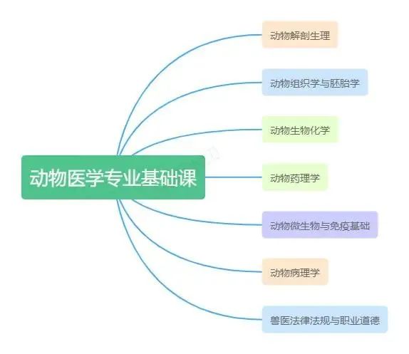 动物解剖生理、动物组织学和胚胎学、动物生物化学、动物药理学、动物微生物与免疫基础、动物病理学、兽医法律法规与职业道德、动物寄生虫病学、动物传染病学、兽医临床诊断技术、禽病学、兽医产科、兽医外科、兽医内科,兽医公共卫生学。