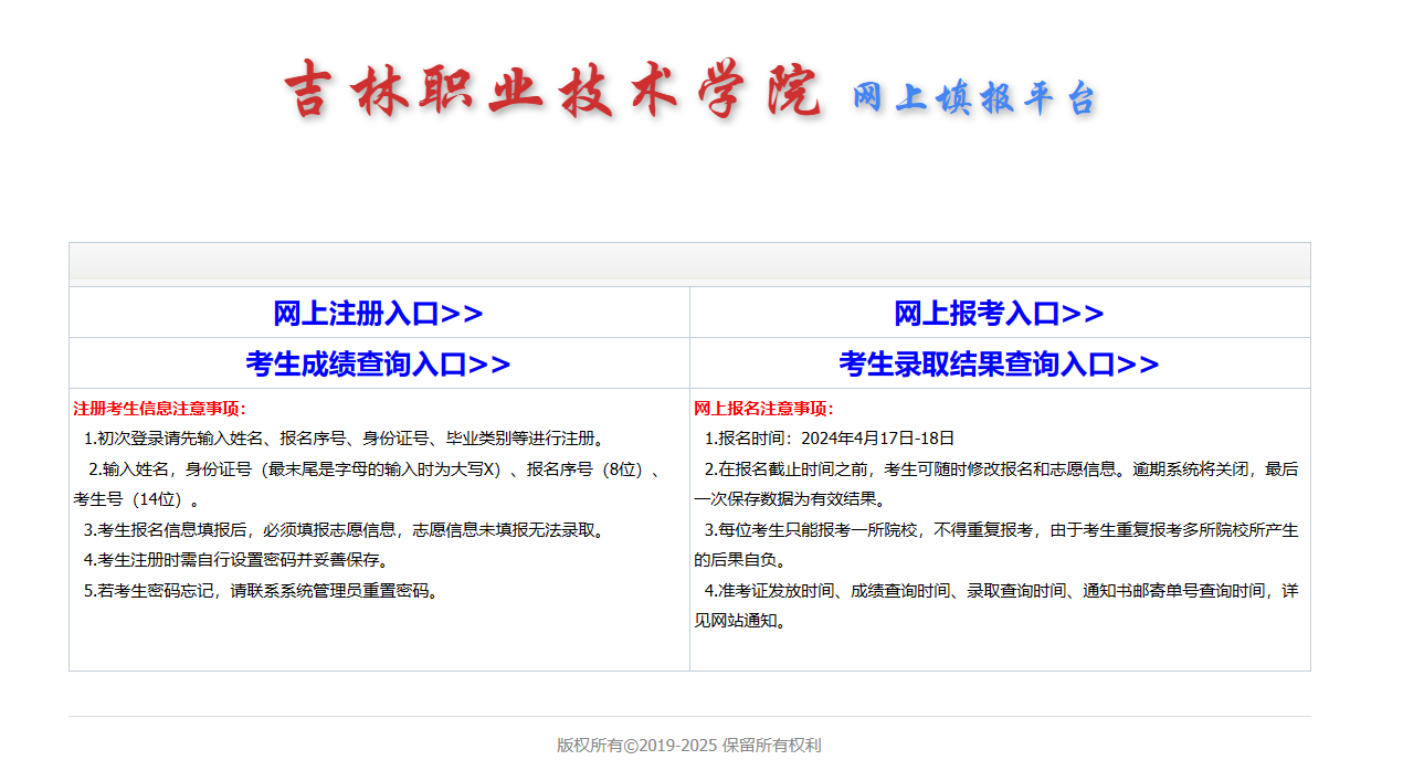 注:所有考生需要先点击左侧【网上注册入口】,注册个人信息后,再点击右侧【网上报考入口】,进行志愿填报。