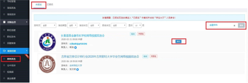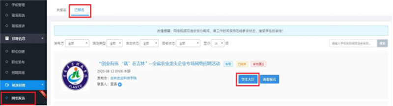 进入“网络双选-已报名”栏目查找已经报名并审核通过的双选会,点击双选会列表后方“学生大厅”按钮,进入会场。