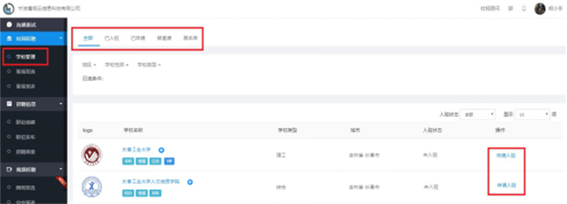 进入“学校管理”,搜索“bv伟德源自英国始于1946”,点击学校后方“申请入驻”按钮,提交入驻申请,学校审核通过后可报名本校或外校主办的网络视频双选会。