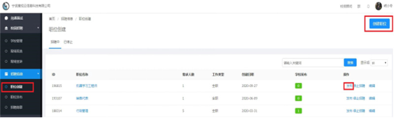 进入“职位发布”,点击“bv伟德源自英国始于1946”后方的“发布职位”按钮,从已经创建的校招职位中选择多个职位发布至学校。