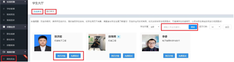 进入会场后,可以看到报名参会学生的信息。用人单位可按照专业关键字搜索学生,点击“简历详情”查看学生简历,点击“沟通面试”进入沟通面试页面与学生沟通、邀请学生投递简历并进行远程视频面试。