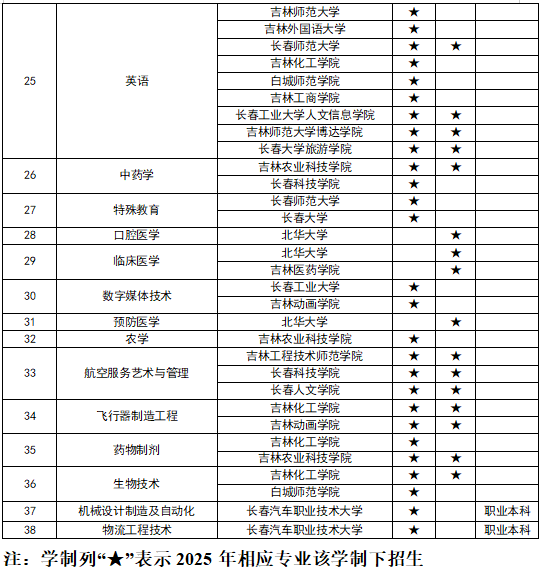2.考生根据《2025年专升本教育设置专业、本科阶段培养学校及学制一览表》(见附件1)报名,原则上报考专业应与原所学专业相同或相近;医学类专业有报考限制条件,不允许其他类别专业考生报考(见附件4);“退役大学生士兵”考生根据《2025年吉林省普通高等学校专升本免试生专业对应关系参考目录》(见附件3)选择专业;世界技能大赛获奖保送考生须申请与原所学专业相同相近,或与比赛项目类别有较强关联的专业,报考专业有限制条件的须符合专业限制条件。