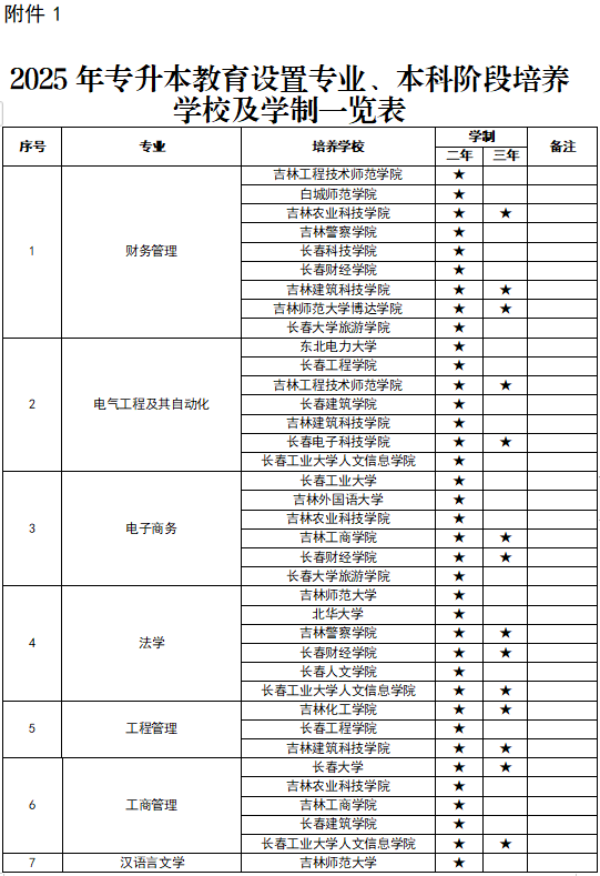 附件1:2025年专升本教育设置专业、本科阶段培养学校及学制一览表