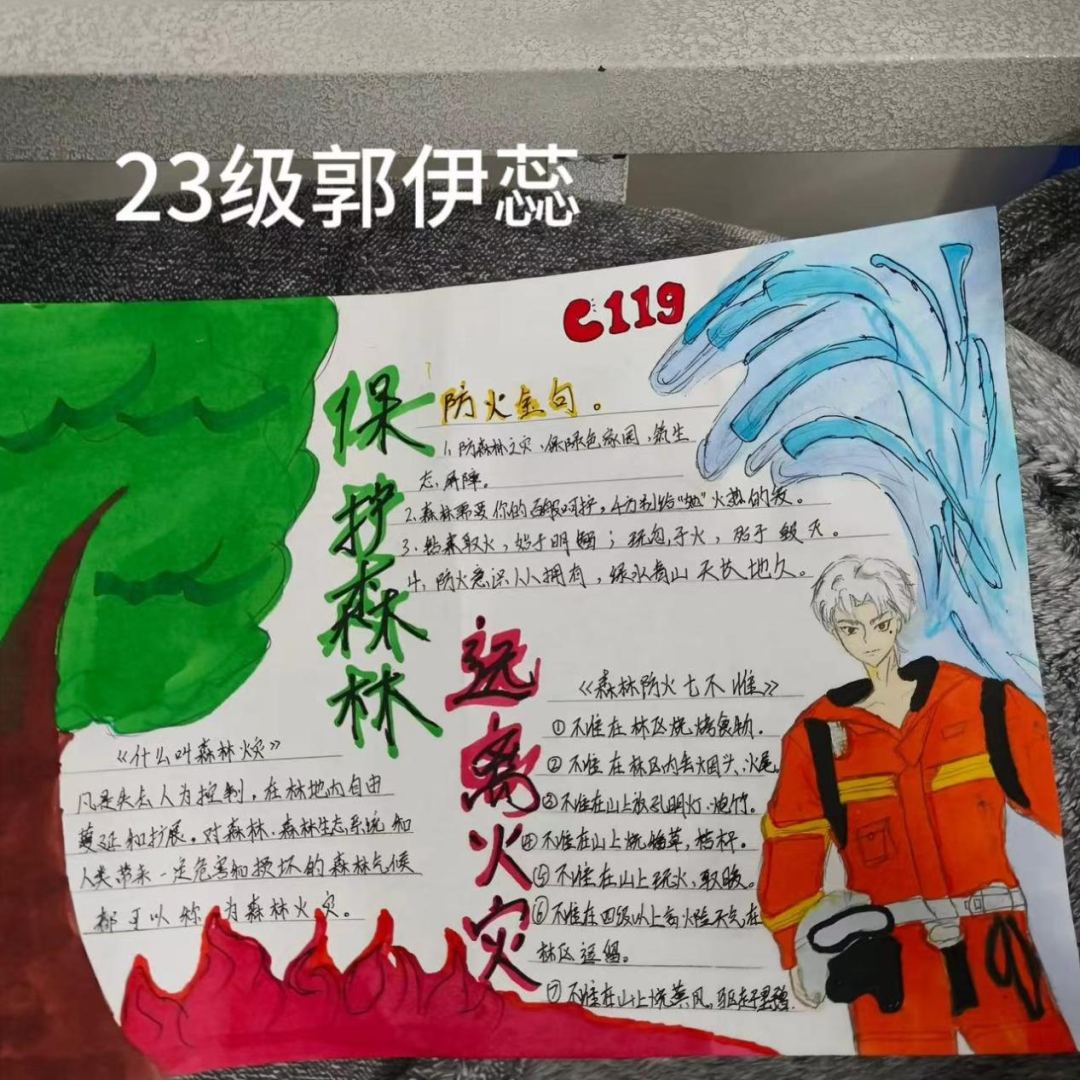 同学们充分发挥自己的绘画能力,将心灵之声绘画成立意新颖、创意独特的海报和手抄报,用最绚丽的图案、最生动的语言文字、最真实的情感,充分展示和体现了“让绿色拥抱大地,让火灾远离森林”的主题。