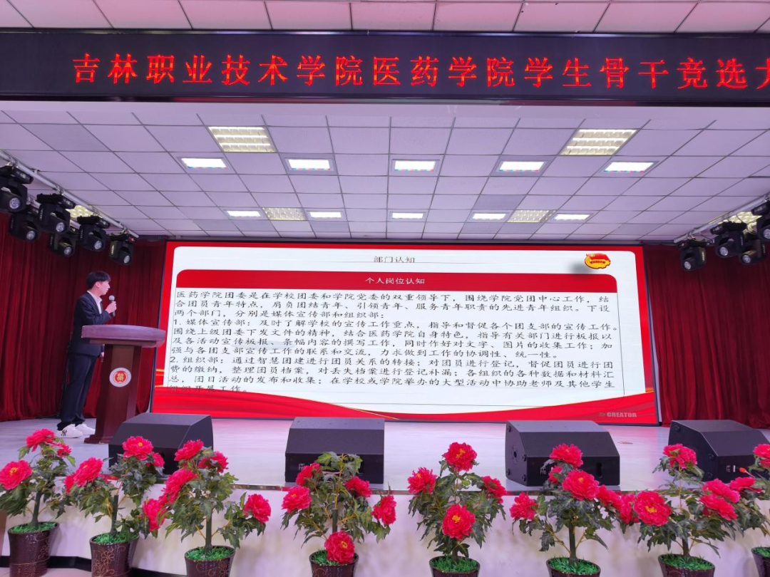 竞选者在台上充分展示了自己的独特优势和才华,陈述自身具有的优势和当选之后的工作计划,经过激烈角逐,医药学院团委第一副书记李昊燃,医药学院团委组织部张婷毓,医药学院学生会主席王卓然,医药学院学生会文体部部长靳昊霖,医药学院自律委员会主席唐亚洲,医药学院自律委员会生活部部长孙艺鑫竞选成功。