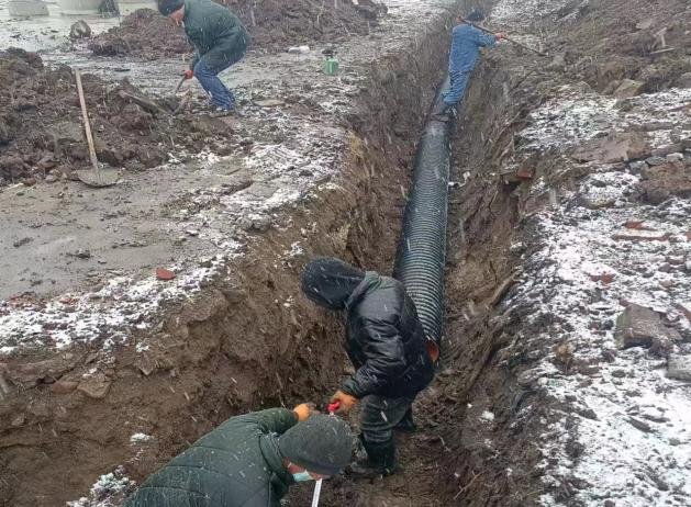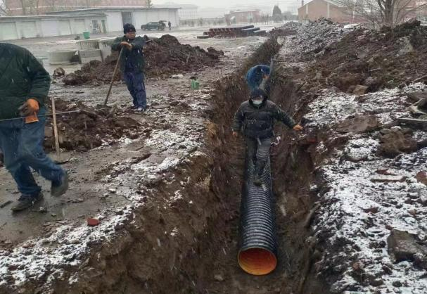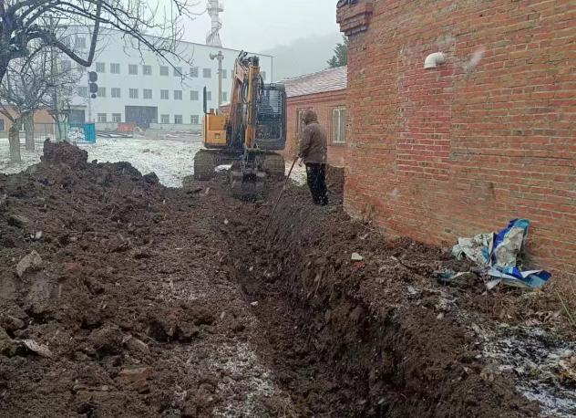 后勤处工作人员不畏严寒,分工协作,根据施工图纸,准确定位挖地沟和铺设下水管道的施工区域,使用挖掘机和铁锹挖掘沟槽,将下水管道安装到沟槽内,再用专业工具将下水管道密封连接,确保连接处不漏水。
