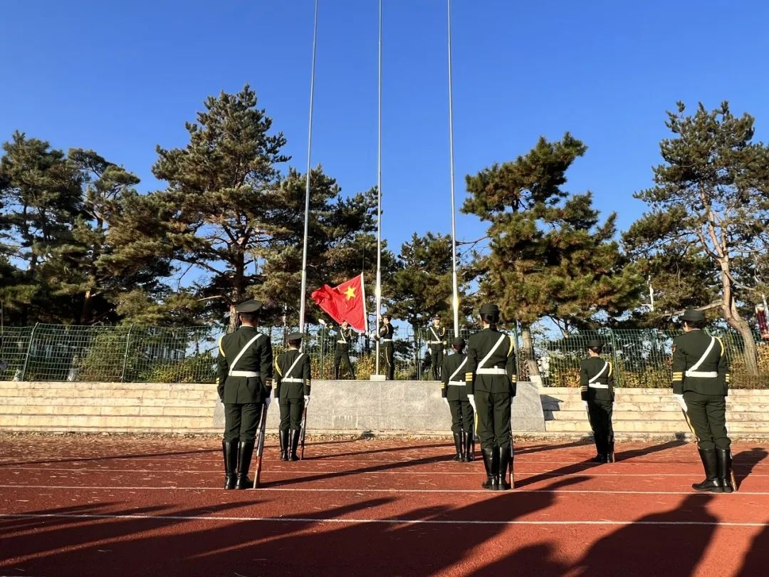 伴随着全体师生的注视,国旗护卫队迈着整齐的步伐,整齐划一、铿锵有力的护送国旗入场,那抹庄严而神圣的红色伴随着《中华人民共和国国歌》冉冉升起,迎风飘扬。