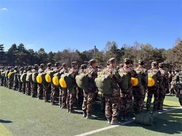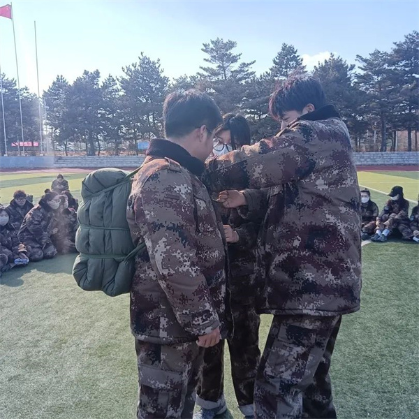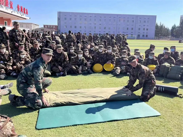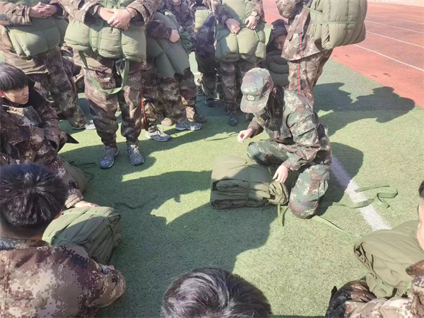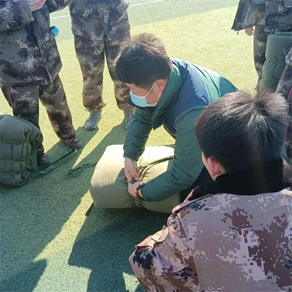 训练时,教官们为同学们演示如何“打背包”,看似简单的“打背包”,锻炼了同学们的耐力、抗压能力、灵活性和协调性。
