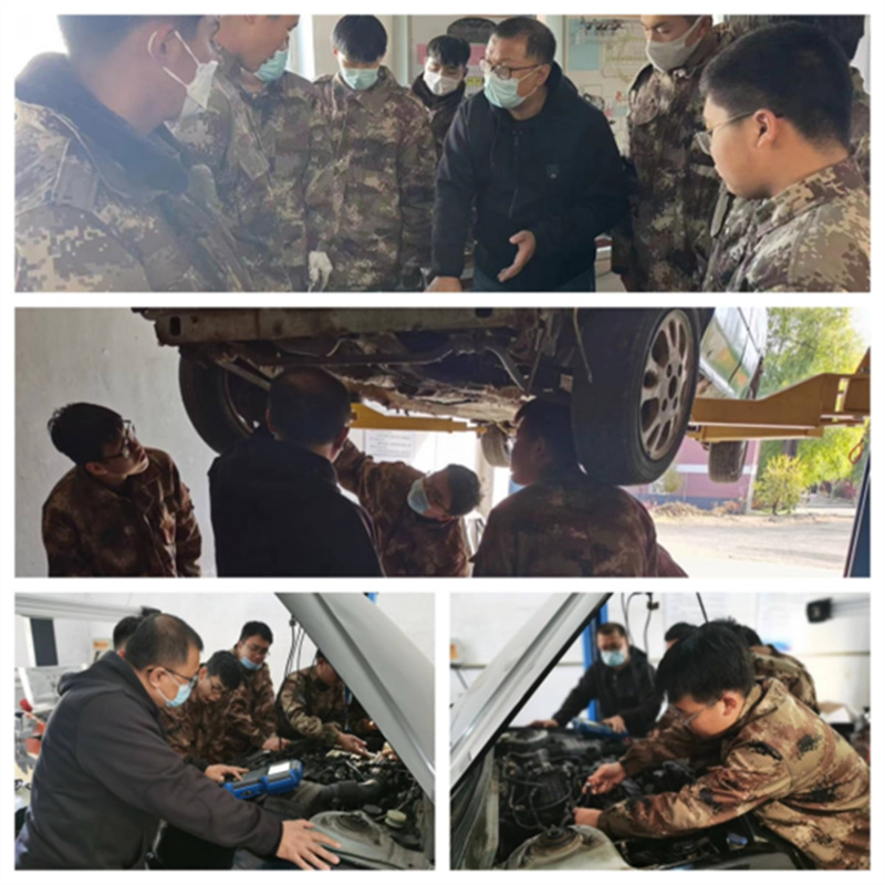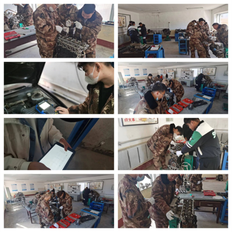 图为吴庆老师带领学生们进行发动机结构拆装和电控系统故障诊断实训