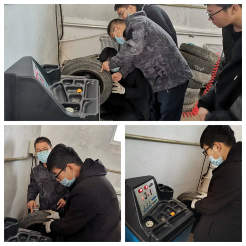 图为杨策老师带领学生们进行底盘结构教学环节中的轮胎动平衡实训