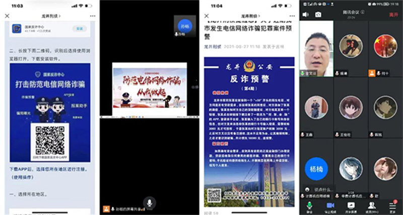 会上,全体辅导员以龙井市公安局刑事侦查大队提供的《反诈宣传进行时》案例警示宣传展板为教育内容,线上组织新生进行学习,教育学生认识网络信息时代诈骗具有高隐蔽性、高诱惑性和杀熟性,引导学生牢固树立安全反诈意识,做好自我保护。