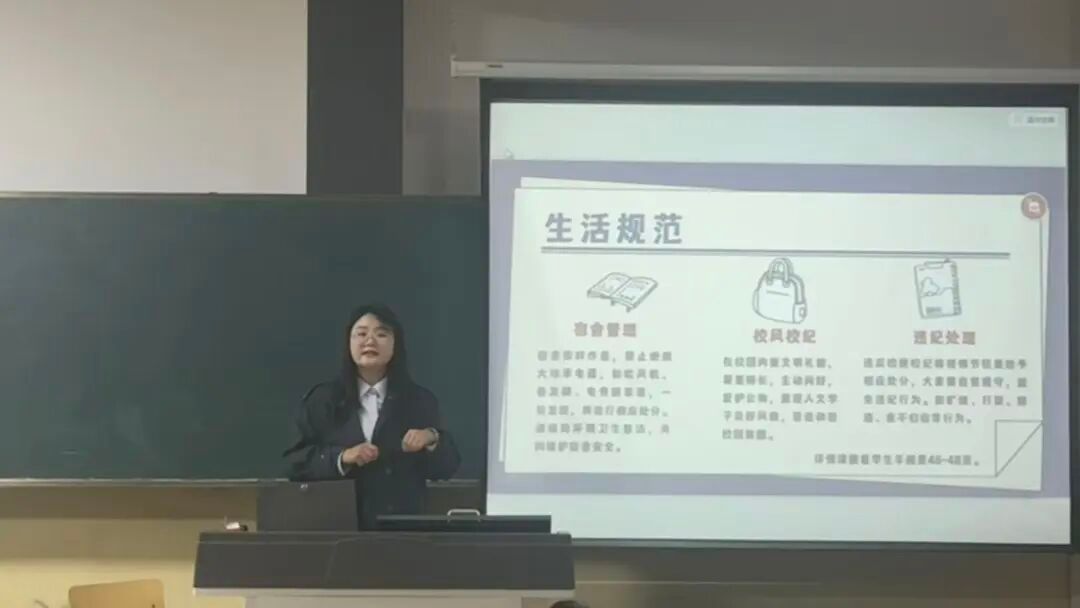 孙畅结合自身工作履历与教育经验,以亲切易懂的语言拉近与新生的距离。随后,课程围绕 “学生管理规范” 与 “入党启蒙教育” 两大核心板块展开,为新生构建起全面的校园认知体系。在学生管理方面,孙畅从校园安全、纪律意识、学术规范、宿舍生活等关键维度切入,系统梳理了校园管理的核心要求 —— 既详细解读了消防安全、用电安全、人身财产安全等底线准则,也明确了课堂考勤、考试纪律、学术诚信等行为规范,引导新生树立 “规则先行” 的意识,守住大学生活的行为边界。同时,她还针对班委选举流程、党团工作开展方式、学业发展规划要点及校园文化活动参与途径等内容进行细致讲解,帮助新生全面了解校园生活的多元维度,为后续参与校园建设、提升综合素养提供清晰指引。