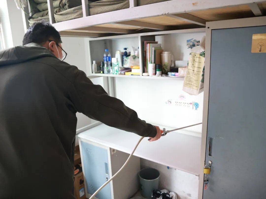 消杀实施阶段,后勤人员以“阻断疾病传播链”为核心导向,精准覆盖病原体易传播的关键区域:在寝室楼宇公共区域,优先针对垃圾桶周边、卫生间地漏、下水管道口等害虫高频聚集且易滋生细菌的点位,采用“药剂喷洒+滞留处理”相结合的方式,最大限度消除害虫栖息环境与病原体滋生温床;进入寝室内部前,后勤人员提前与学生沟通确认,在确保室内无人员停留后,聚焦衣柜后方、书桌缝隙、床底等害虫易藏匿的卫生死角开展精准施药,从源头减少病原体载体。整个消杀过程中,后勤人员严格遵循药剂配比规范,全程避开学生衣物、食品、电子设备等生活用品,最大程度降低潜在影响;消杀完成后,还会逐一向学生告知“开窗通风30分钟以上再进入室内”“接触桌面、衣柜等区域前简单擦拭”等疾病预防注意事项,强化安全防护效果。