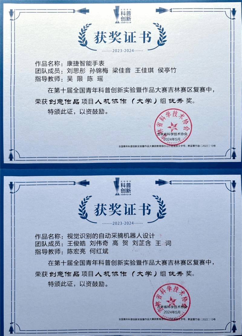 (通讯员 马雪菲 陈宏亮)为促进青年学生利用科技手段和创新思维,开展创意实验设计、激励广大青年学生踊跃开展科技创新实践活动,由吉林省科学技术协会、共青团吉林省委主办,吉林省科技馆承办的第十届全国青年科普创新实验暨作品大赛吉林赛区决赛在吉林省科技馆落下帷幕。该项比赛为面向青年学生的全国性科普赛事,经过激烈角逐,bv伟德荣获优秀组织单位荣誉;bv伟德教师陈宏亮、吴限荣获优秀组织个人奖;来自bv伟德科创社团刘思彤、孙锦梅、王俊皓、刘伟奇等成员带来的创意作品《康捷智能手表》、《视觉识别的自动采摘机器人设计》获得高校组优秀奖。