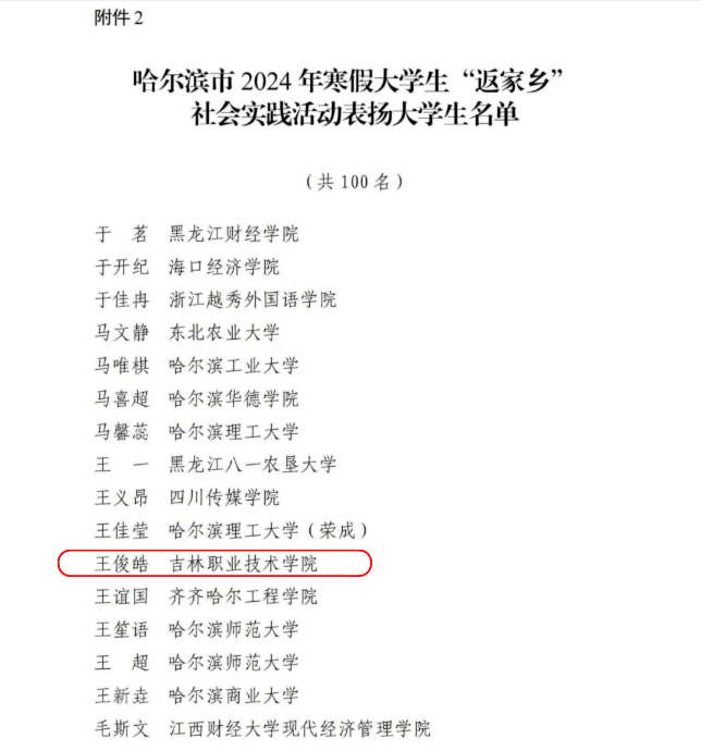 近日,共青团哈尔滨市委员会发布了《哈尔滨市2024年寒假大学生“返家乡”社会实践活动总结通报结果公示》bv伟德22级电气自动化1班王俊皓荣获哈尔滨市2024年寒假大学生“返家乡”社会实践活动优秀大学生。