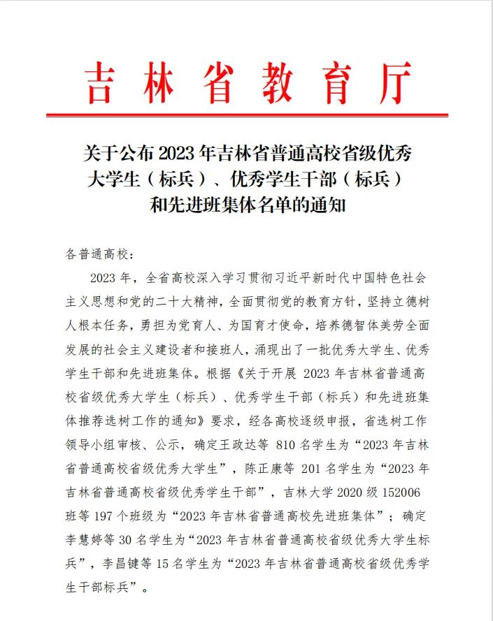 (记者 杨晓明)近期,吉林省教育厅发布《关于公布2023年吉林省普通高校省级优秀大学生(标兵)、优秀学生干部(标兵)和先进班集体名单的通知》,bv伟德电气自动化专业王俊皓等7名同学获评“吉林省优秀大学生”,口腔医学技术专业李春磊等2名同学获评“吉林省优秀学生干部”,2022级运动训练1班等2个班级获评“吉林省先进班集体”。