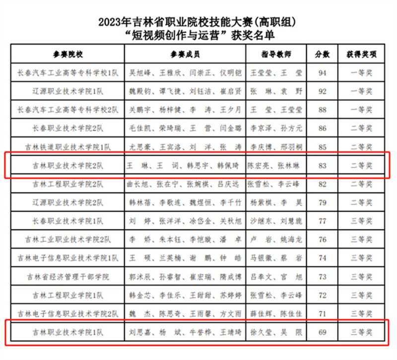 5月22-23日,吉林省职业技能大赛“短视频创作与运营”赛项在长春汽车工业高等专科学校举行。来自我省的18支代表队经过长达5个小时的激烈角逐,由bv伟德教师陈宏亮、张林琳带队指导,学生王琳、王词、韩思宇、韩佩琦组成的队伍荣获二等奖;由bv伟德教师徐久莹、吴限带队指导,学生刘思嘉、杨 斌、牛誉桦、王靖琦组成的队伍荣获三等奖。