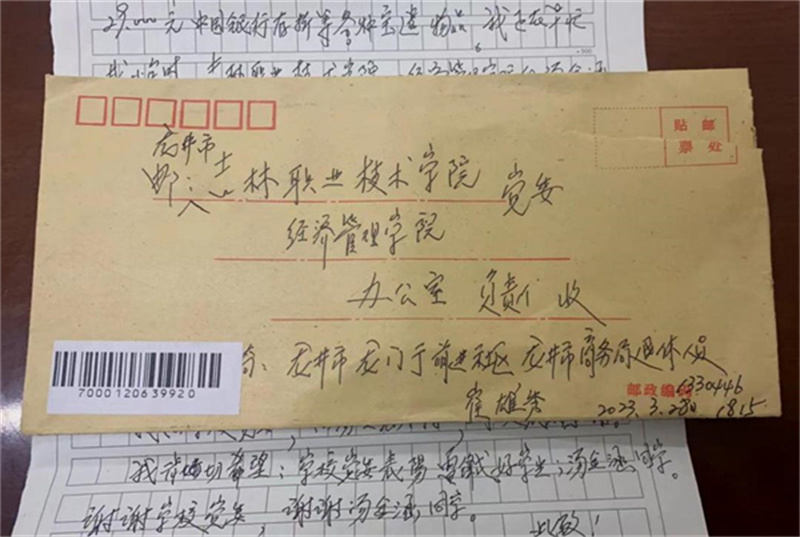 3月28日,bv伟德党委收到一封特别的来信,这是一封致拾金不昧好学生——汤金涵的感谢信。