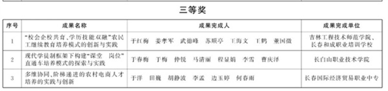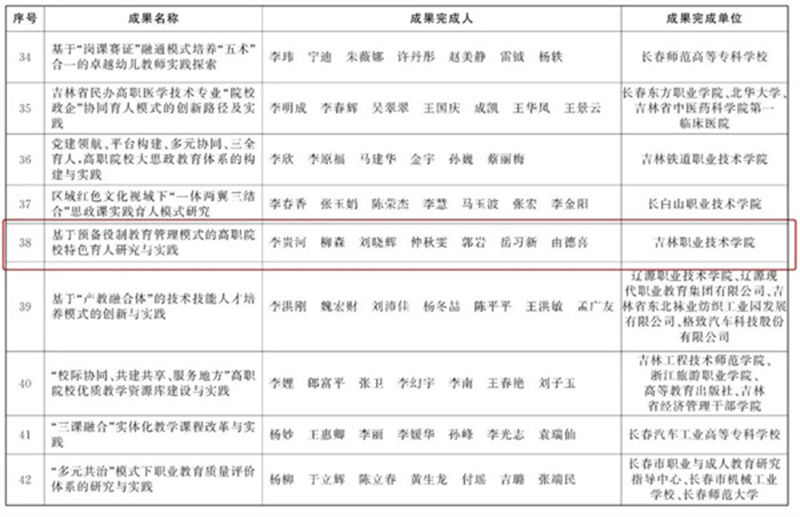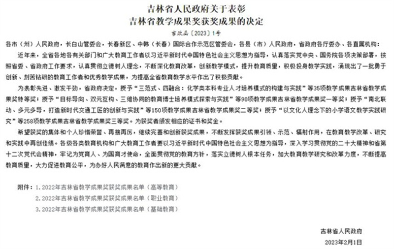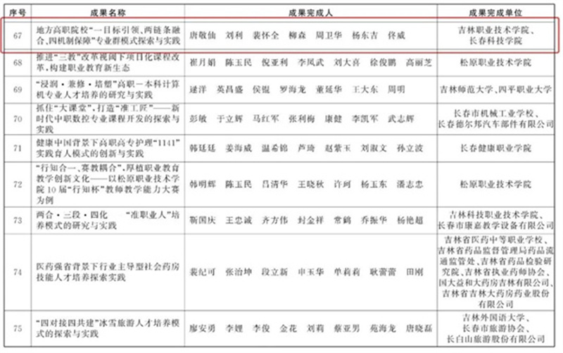 2月8日,吉林省人民政府公布了关于表彰吉林省教学成果奖获奖成果的决定。经综合评审,“基于预备役制教育管理模式的高职院校特色育人研究与实践”和“地方高职院校“一目标引领、两链条融合、四机制保障”专业群模式探索与实践”教学成果均荣获吉林省教学成果奖三等奖。