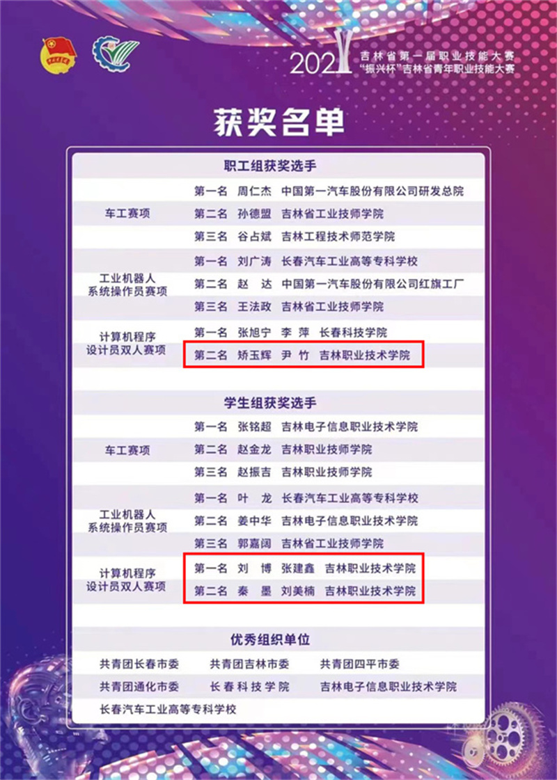 为深入学习贯彻习近平总书记致首届全国职业技能大赛贺信精神,落实省人才工作暨创新型省份建设大会精神,深化推进人才强省战略,帮助青年技能人才搭建学知练技、交流分享平台。12月24日至26日,由团省委、省人社厅共同主办的吉林省第一届职业技能大赛2021年“振兴杯”吉林省青年职业技能大赛在长春举行。经综合评审,bv伟德教师矫玉辉、尹竹荣获职工组计算机程序设计员双人赛项二等奖,学生刘博、张建鑫荣获学生组计算机程序设计员双人赛项一等奖,学生秦墨、刘美楠荣获学生组计算机程序设计员双人赛项二等奖。