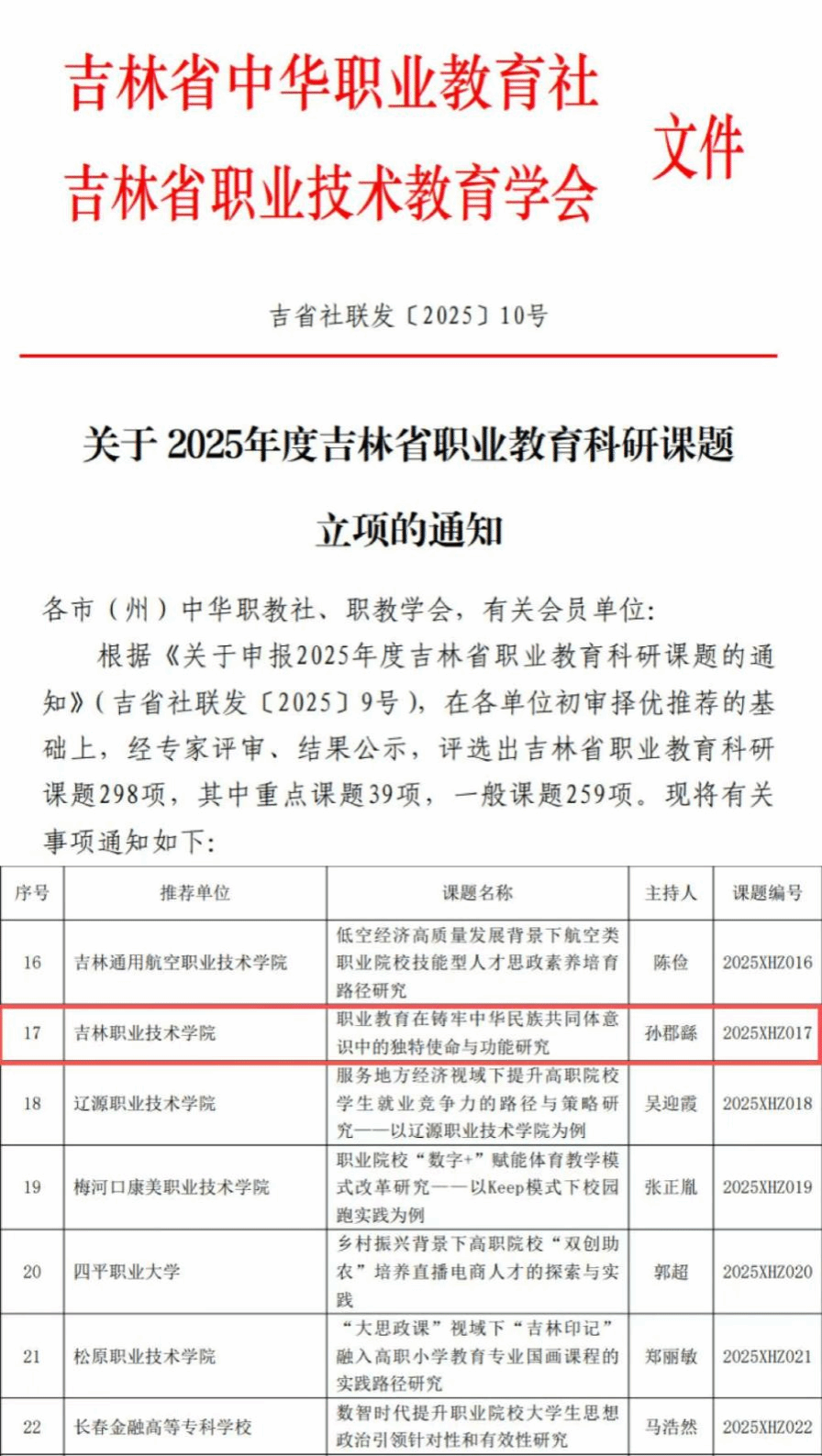 (通讯员 马雪菲)近日,吉林省职业教育科研管理平台正式公布 2025 年度吉林省职业教育科研课题立项名单,bv伟德青年教师孙郡繇主持的《职业教育在铸牢中华民族共同体意识中的独特使命与功能研究》凭借鲜明的创新价值、扎实的研究基础和严密的论证逻辑,成功获批重点课题立项,这是bv伟德在职业教育科研领域的又一重要突破。