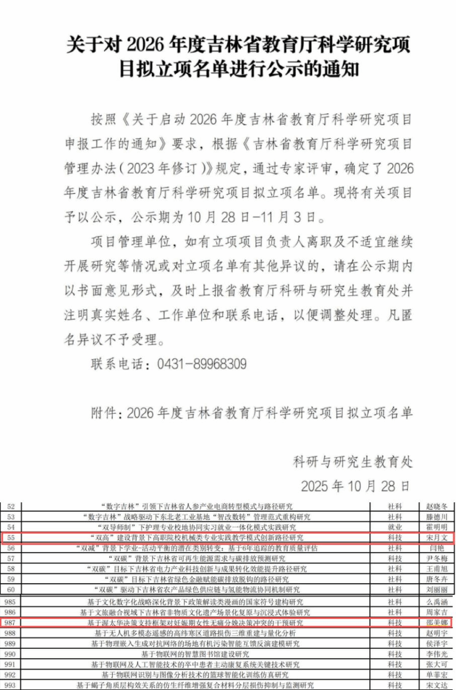 (通讯员 马雪菲)近日,吉林省教育厅正式公布 2026 年度科学研究项目立项名单。在学校领导的高度重视与统筹部署下,经科研管理部门精心组织、各二级单位协同推进、广大教师积极申报,bv伟德教师宋月文主持的《“双高” 建设背景下高职院校机械类专业实践教学模式创新路径研究》;邵美娜主持的《基于渥太华决策支持框架对妊娠期女性无痛分娩决策冲突的干预研究》凭借扎实的科研基础、创新的研究思路和精准对接区域需求的选题规划,在本次评审中脱颖而出,实现了bv伟德科研工作的阶段性重大突破!