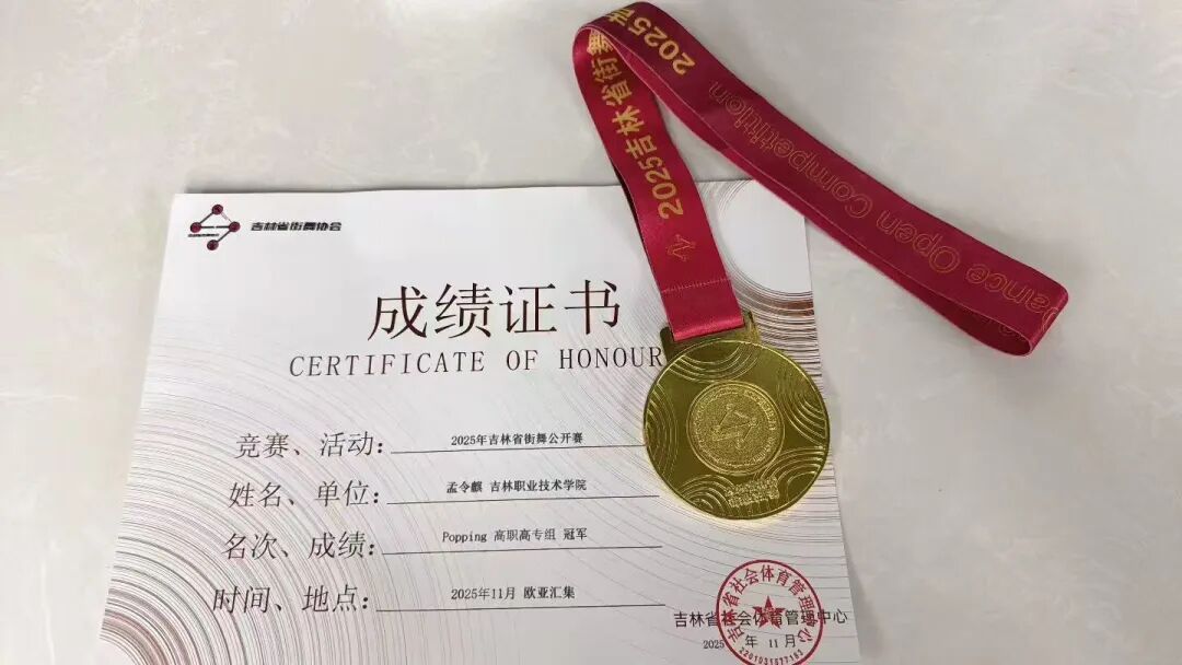 (通讯员 王宁)动感旋律燃动赛场,精湛舞姿定格荣光。11月23日,吉林省街舞公开赛顺利收官,bv伟德孟令麒同学凭借稳定发挥与强劲实力,勇夺高校高职高专组Popping斗舞项目冠军,这份亮眼战绩的背后,离不开指导教师王迪的悉心耕耘与无私付出,每一份荣誉都镌刻着师者的坚守与匠心。