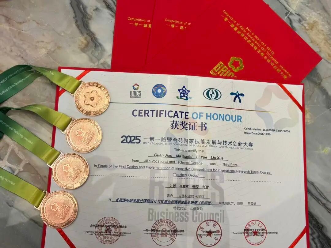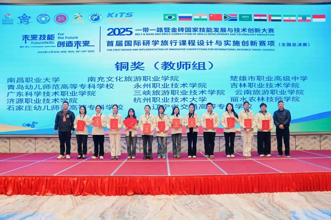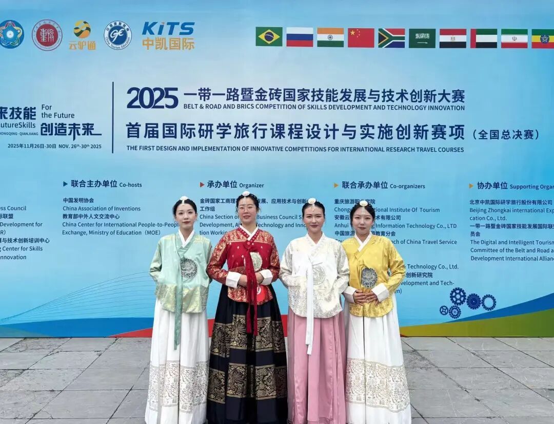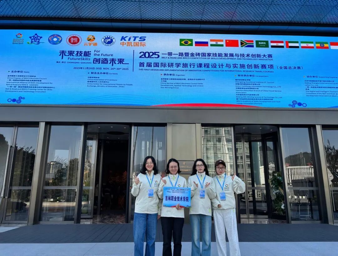 (通讯员 马雪菲)近日,2025“一带一路”暨金砖国家技能发展与技术创新大赛首届国际研学旅行课程设计与实施创新赛项全国总决赛在重庆旅游职业学院圆满落幕。由bv伟德教师关娇、刘雪、李悦、马雪菲组成的参赛团队此前在东北赛区赛事中斩获一等奖,成功晋级全国总决赛后,再度凭借扎实的专业功底、创新的课程设计与出色的现场展示,最终荣获国赛铜奖,实现区域赛与全国赛的双重突破,充分展现了学校在研学旅行人才培养与课程创新领域的强劲实力。