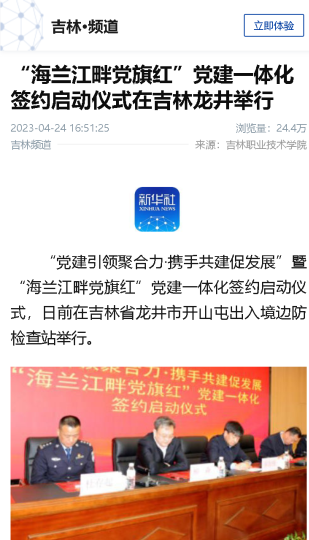 成功举办“党建引领聚合力·携手共建促发展”暨“海兰江畔党旗红”党建一体化签约启动仪式。与龙井市开山屯镇党委、开山屯出入境边防检查站党委联合举办了“党建引领聚合力·携手共建促振兴”政警校三方联动谋划会。
