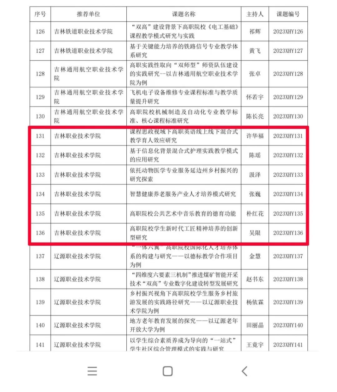 成功申报省级科研课题31项。完成省级课题开题5项,职业教育科研课题6项,职教学会科研课题1项,组织结题验收24项。“基于预备役制教育管理模式的高职院校特色育人研究与实践”和“地方高职院校“两项教学成果均荣获吉林省教学成果奖三等奖。