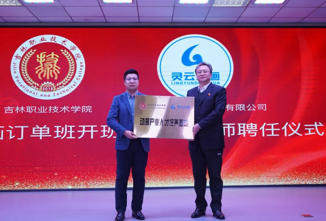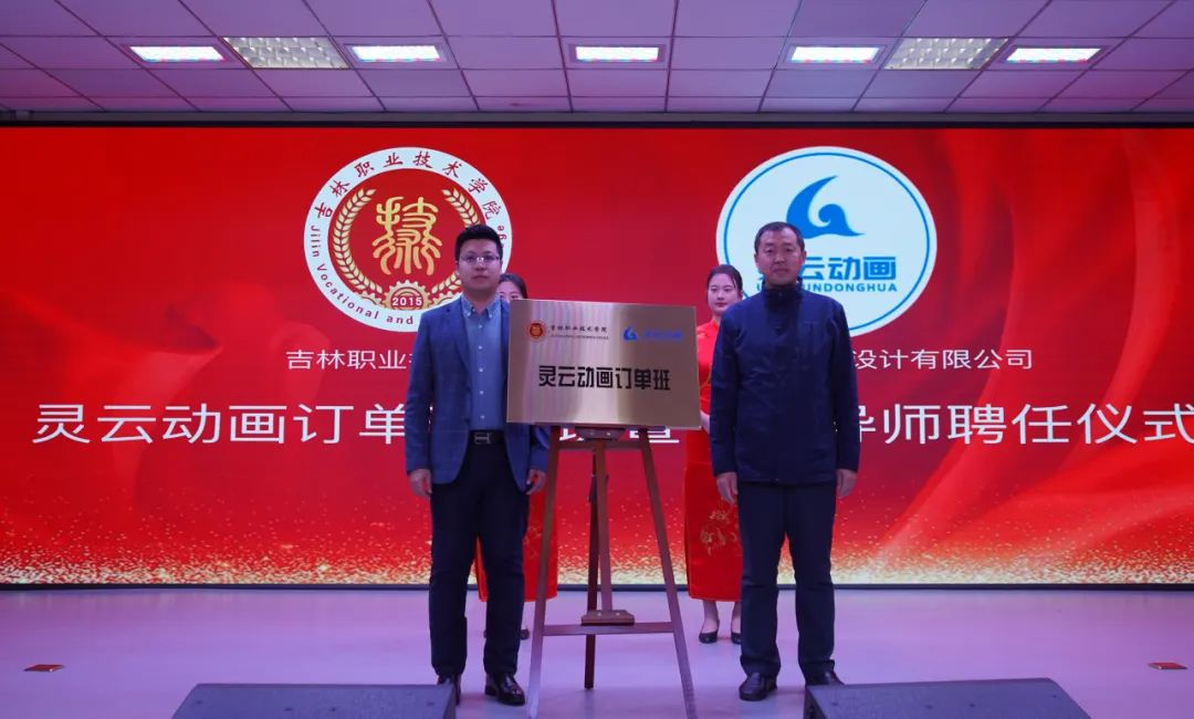 在热烈的掌声中,张鑫、崔振宇为灵云动画订单班揭牌。