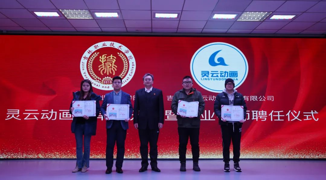 柳森为“动漫产业人才培养基地”授牌,并为订单班企业导师张鑫、刘治国、郐思琪、时杰颁发聘书。