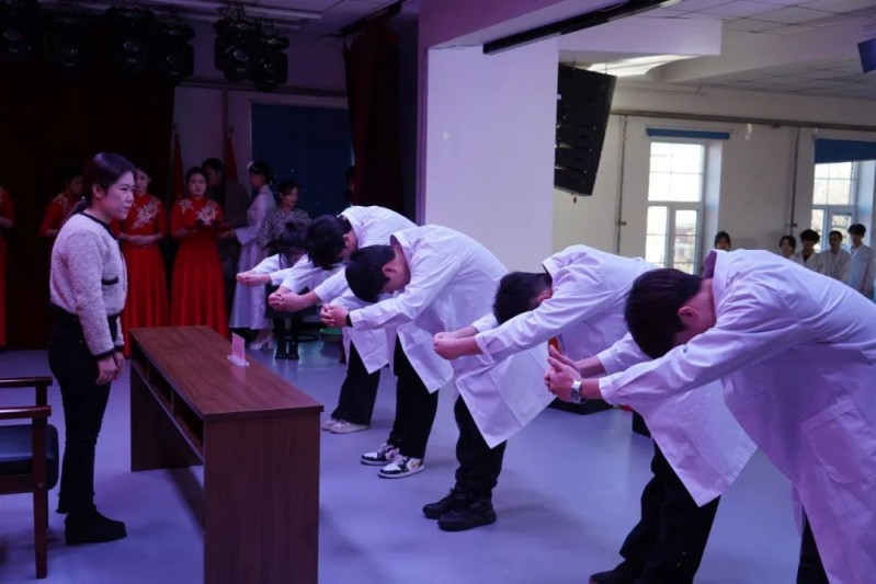 拜师仪式中,学生们分组向导师敬茶并行拜师礼,展现了对导师的尊敬和对未来学习生涯的期待。朝医学专业导师于诗雨带领学生们庄严宣誓,铮铮誓言回荡在报告厅内,彰显了他们对医学事业的无限忠诚与对专业精神的执着坚守。