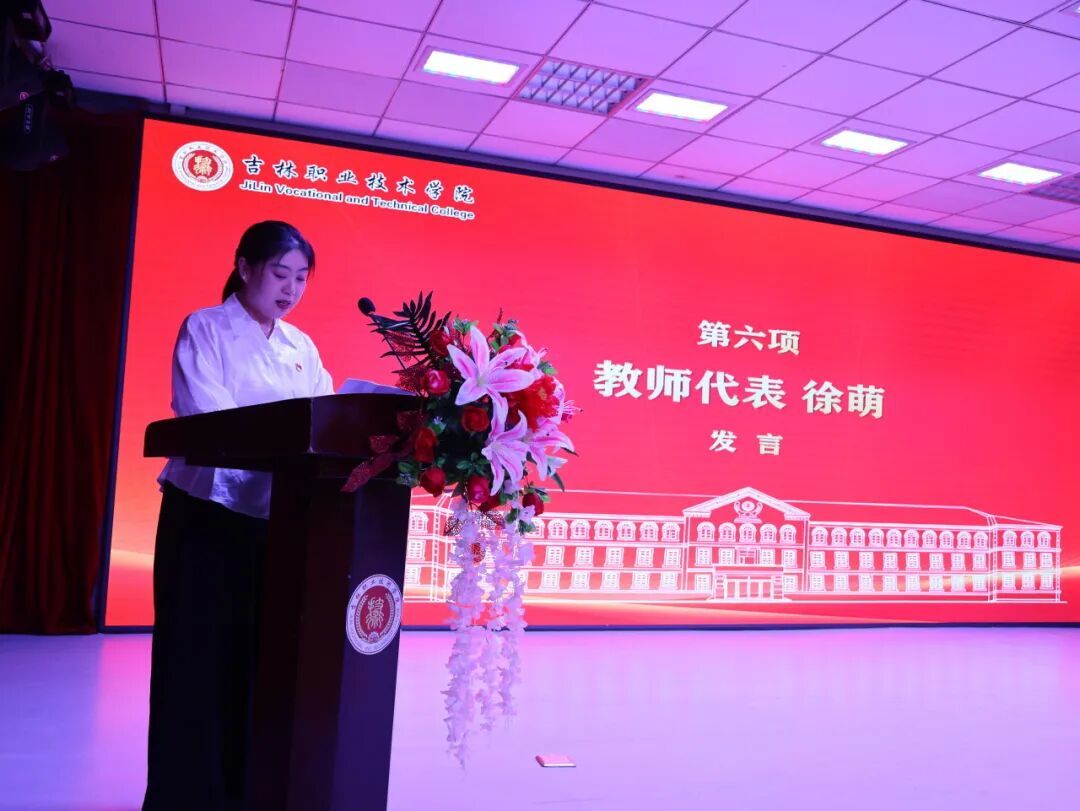教师代表人文学院徐萌老师在发言中表示,选择教育便是扛起传播知识、塑造灵魂的重任,清晨备课、深夜批改、耐心辅导皆源于对教育的热爱;而学生的问候、进步与成长,是教师最珍贵的收获。她感恩学校、领导与团队的支持,并呼吁同仁牢记育人初心,以更高标准助力教育事业。