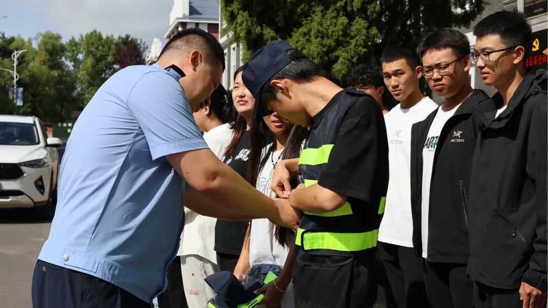 警用装备发放环节,龙井市交警管理大队教导员李守文带领宣传中队工作人员,逐一核对交通指挥手势旗、执勤纪律手册、反光背心等装备,确认完好后分发至义警手中。“这些装备是工作工具,更是责任象征。” 李守文强调,希望义警们带着责任投身志愿服务,助力改善龙井市交通秩序,现场义警的责任感与使命感显著增强。