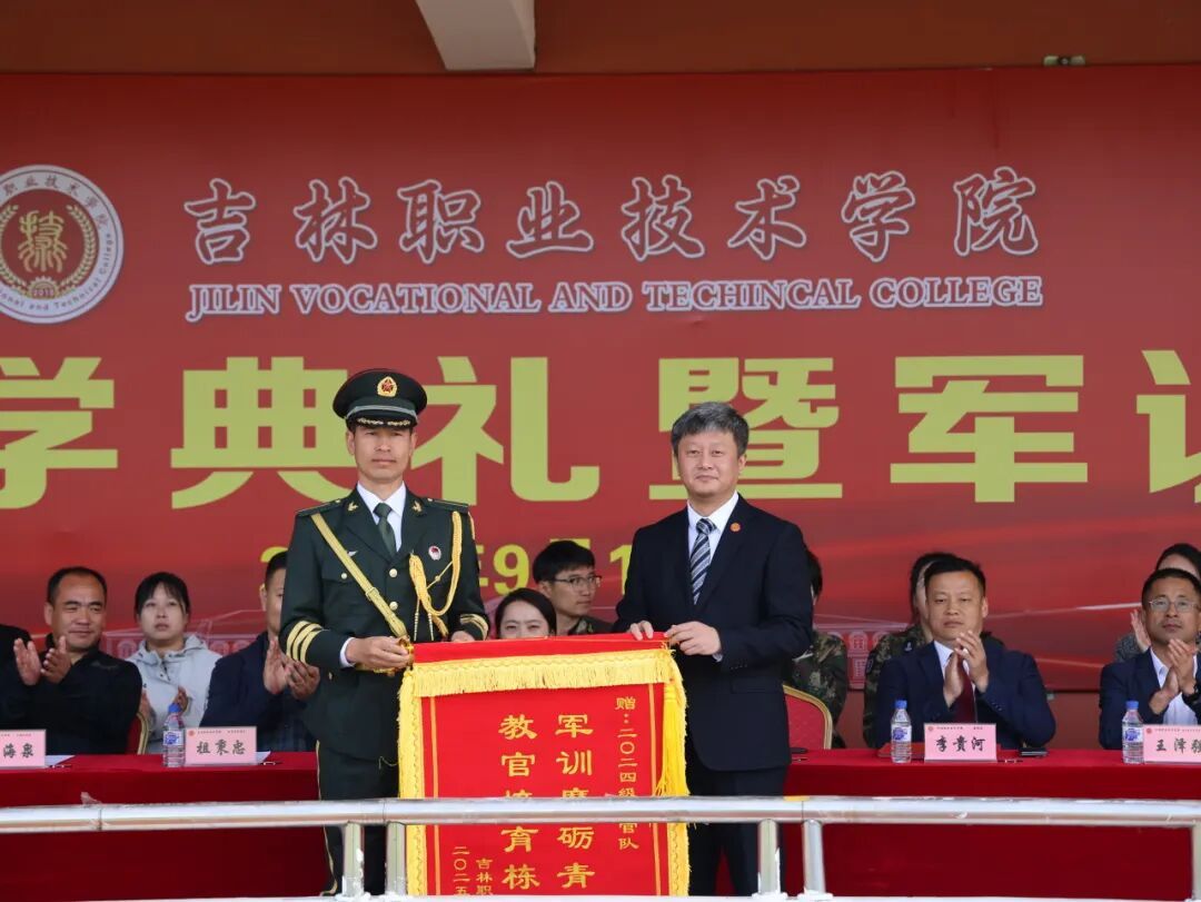 汇报结束后,校党委副书记李可心代表学校向承训教官队授予锦旗,以感谢教官们在军训期间的辛勤付出与悉心指导。