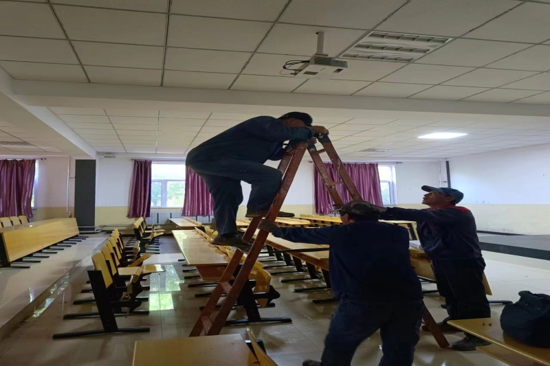 在第二教室里,投影仪的安装是提升教学效果的关键。后勤工作人员精心规划,充分考虑光线、角度等因素,确保投影画面清晰、效果最佳。他们耐心细致地悬挂投影仪、连接线路,不断调整参数,直到满足教学需求,为师生们提供了一个更加优质的教学环境。