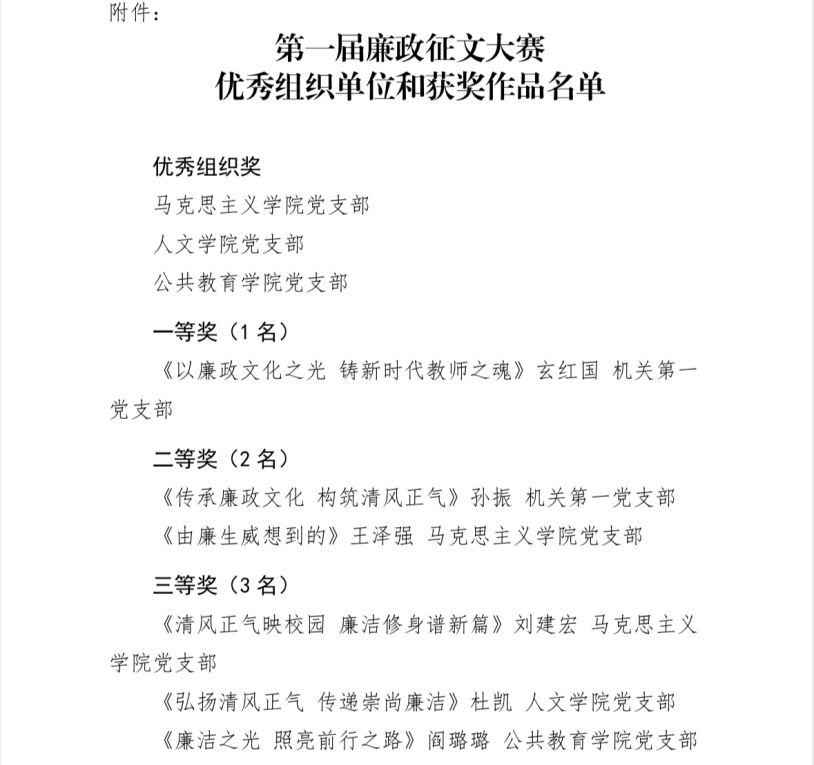 自征文大赛启动以来,人文学院党员积极响应组织,踊跃投稿。他们以自己的亲身经历、深刻感悟和独到见解,撰写了一篇篇主题鲜明、内容丰富的廉政文章。这些文章既有对廉政建设重要性的深刻阐述,也有对身边廉政典型的生动描绘;既有对腐败现象的无情揭露,也有对廉洁自律的深情呼唤。每一篇文章都凝聚着党员们对廉政的执着追求和对教育事业的无限热爱。在征文评选过程中,每一篇文章都经过评委们的认真阅读和公正评选,最终评选出了一批批优秀作品。人文学院党支部荣获优秀组织奖,我院杜凯老师荣获三等奖,闫莉老师、杨雪晴同学荣获个人优秀奖。这些作品不仅文采飞扬、思想深刻,更体现了老师们对廉政文化的深刻理解和积极践行。
