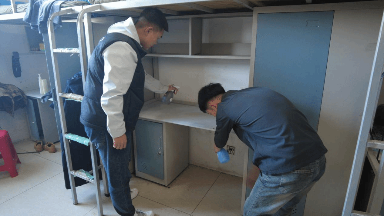 消毒当天,权益部成员以楼栋为单位分组,有序进入各寝室开展工作。大家手持喷壶,重点对门把手、寝室床梯等高频接触区域细致消毒;过程中格外细心,发现随意摆放的物品会轻声提醒收纳,碰到电源插座周边则用酒精棉片小心擦拭,消毒完成后做好标记并告知通风时长。现场氛围温馨,不少同学主动帮忙整理物品、配合工作,马浩洋坚守一线统筹进度,同时指导成员规范操作,鼓励道:“多一份细致,同学们就多一份安心,这正是权益部的价值所在。”