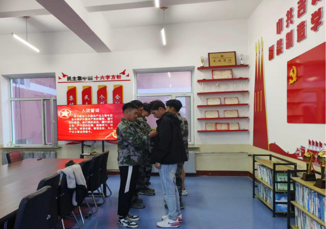 仪式现场庄重,新团员们精神抖擞,意气风发。在严肃的宣誓词前团徽授予环节正式开始。老团员们将一枚枚闪耀着光芒的团徽佩戴在新团员的胸前,象征着共青团精神的传承与延续。