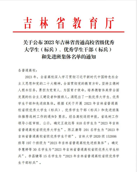 喜报丨我院学生荣获2023年吉林省普通高校省级优秀大学生、先进班集体荣誉称号