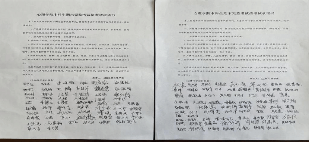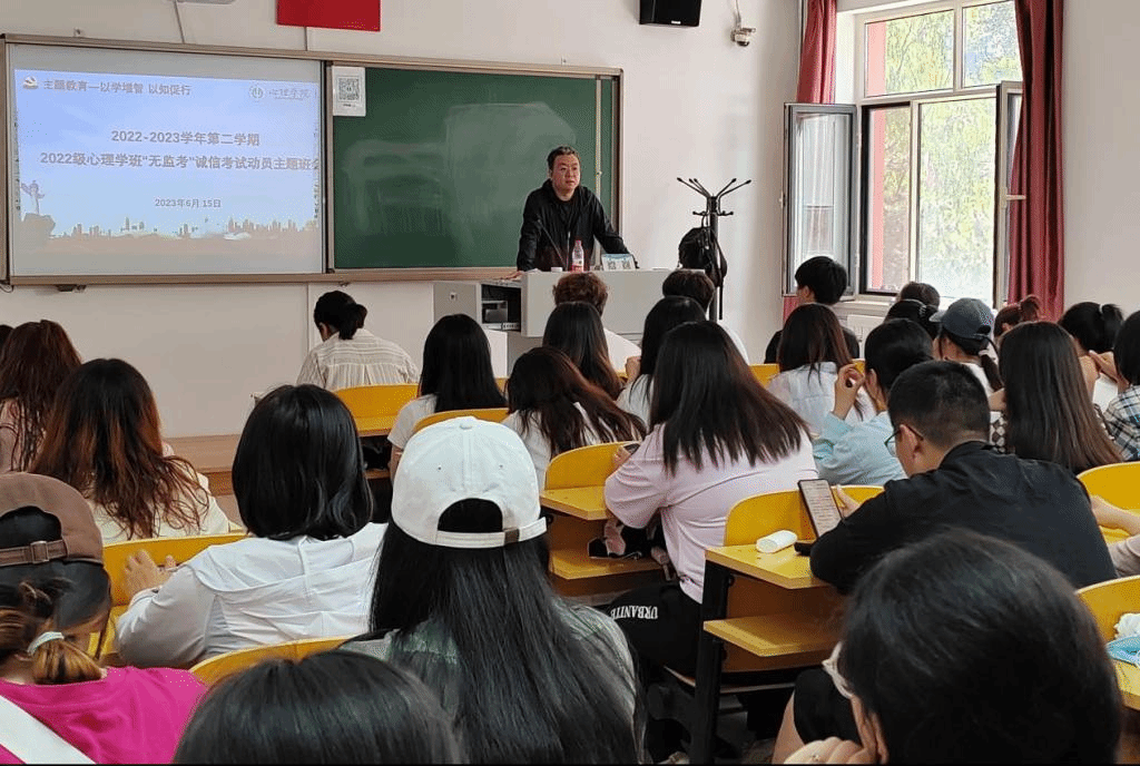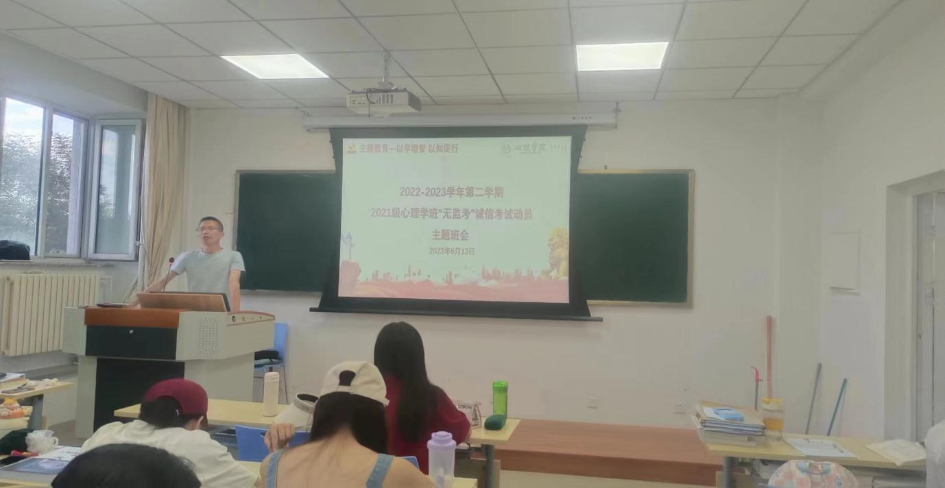 在主题教育推进之际,为进一步加强学院学风建设,做好学生诚信考试教育,确保本学期期末考试顺利进行,近日,新葡萄官网AMG2021级、2022级心理学班分别召开2022-2023学年第二学期“无监考”诚信考试教育主题班会。主题班会分别由班主任董洪杰、梁宏宇主持。