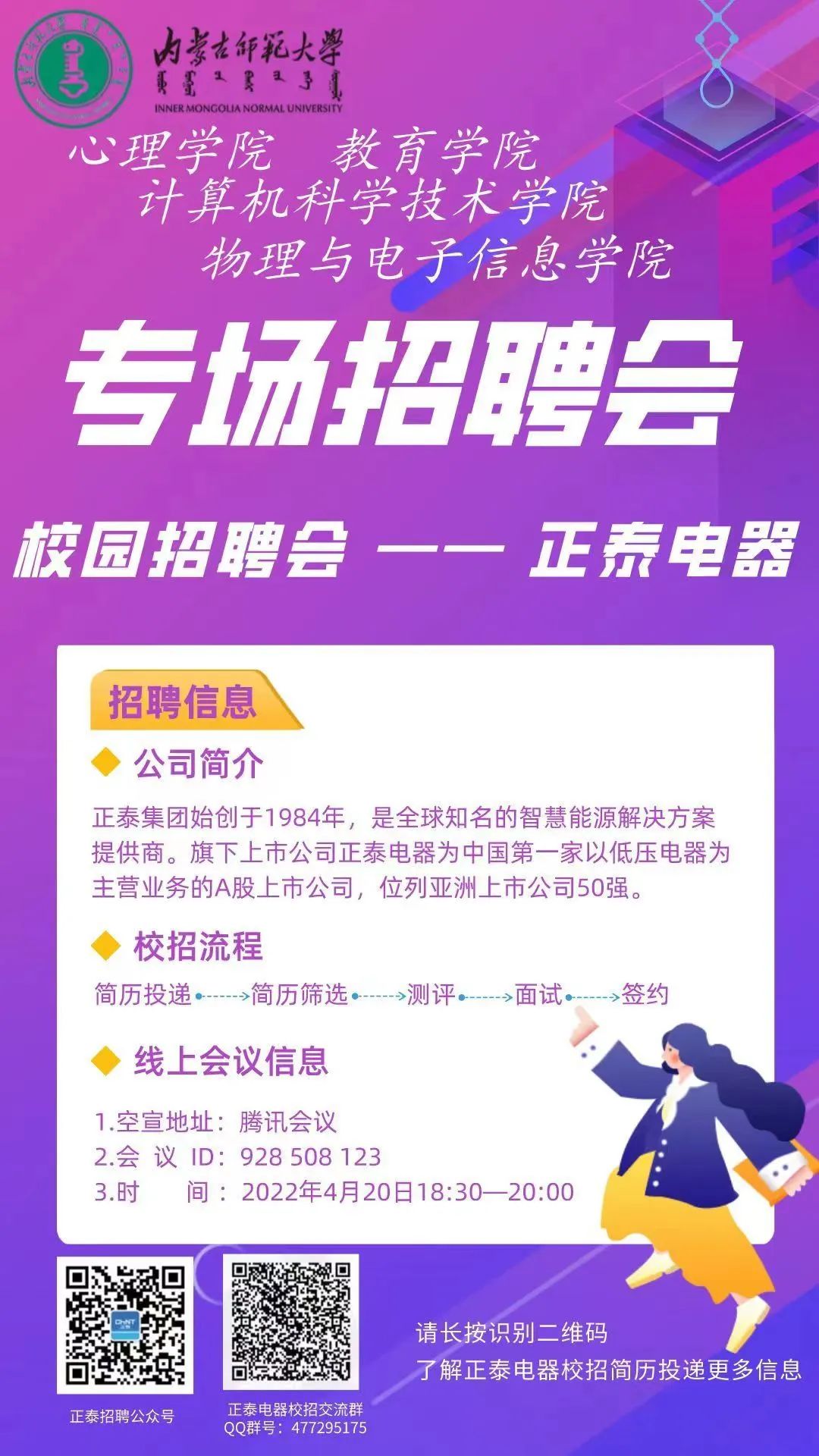 为深入贯彻党中央、国务院“稳就业”“保就业”决策部署,进一步做好毕业生就业工作,拓宽就业渠道,实现高质量就业, 4月20日,新葡萄官网AMG通过校友积极联系正泰电器,面向新葡萄官网AMG、教育学院、物理与电子信息学院、计算机科学技术学院等召开2022届毕业生线上专场招聘会。