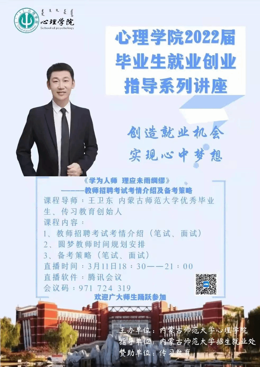 为贯彻党中央、国务院“稳就业”“保就业”决策部署,落实学校推进毕业生就业工作要求,促进新葡萄毕业生高质量就业。2022年3月11日,新葡萄官网AMG特邀请优秀校友、传习教育创始人王卫东为同学们开展“《学为人师 理应未雨绸缪》--教师招聘考试考情介绍及备考策略”专题讲座,学院党委副书记副院长张晓阳参会,学生工作与就业指导办公室主任张金钟主持。