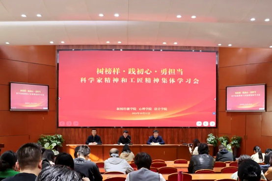 为深入学习贯彻党的二十届三中全会精神,弘扬科学家精神、工匠精神,激发教师教学科研热情,10月31日下午,新葡萄官网AMG、新闻传播学院和设计学院在赛罕校区信息楼报告厅联合举办“树榜样·践初心·勇担当—科学家精神和工匠精神集体学习会”,三个学院全体教师共百余人参加此次会议。