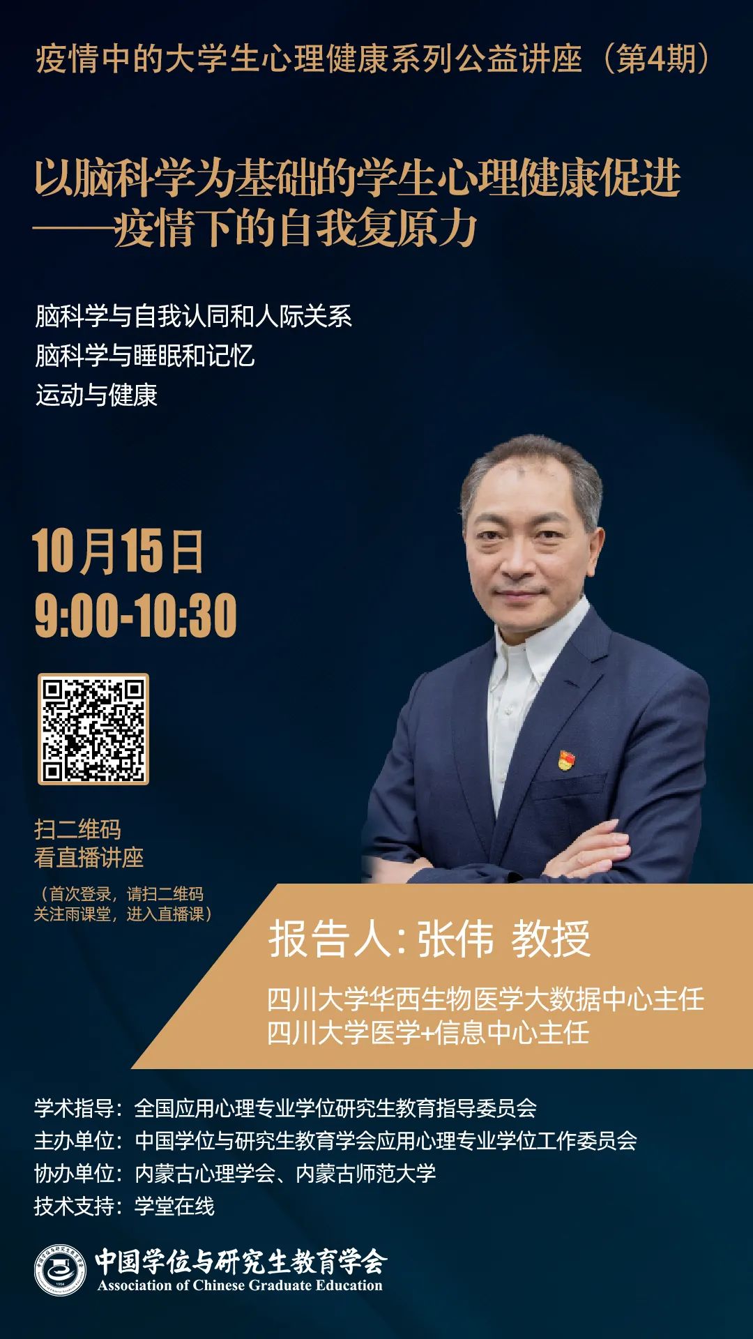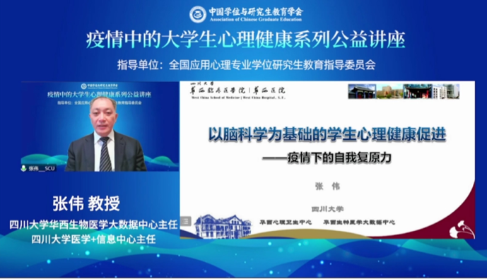 为助力内蒙古高校疫情防控工作,保障全区大学生心理健康,10月15日上午,由全国应用心理专业学位研究生教育指导委员会指导,中国学位与研究生教育学会应用心理专业学位工作委员会承办,内蒙古心理学会、新葡萄88805官网协办的“疫情中的大学生心理健康系列公益讲座(第4期)”在线上举行,特邀四川大学张伟教授做题为“以脑科学为基础的学生心理健康促进—疫情下的自我复原力”专题讲座,新葡萄官网AMG全体师生和全区及全国的4000余名听众通过不同方式观看直播。讲座由全国应用心理专业学位研究生教育指导委员会副主任、北京大学吴艳红教授主持。